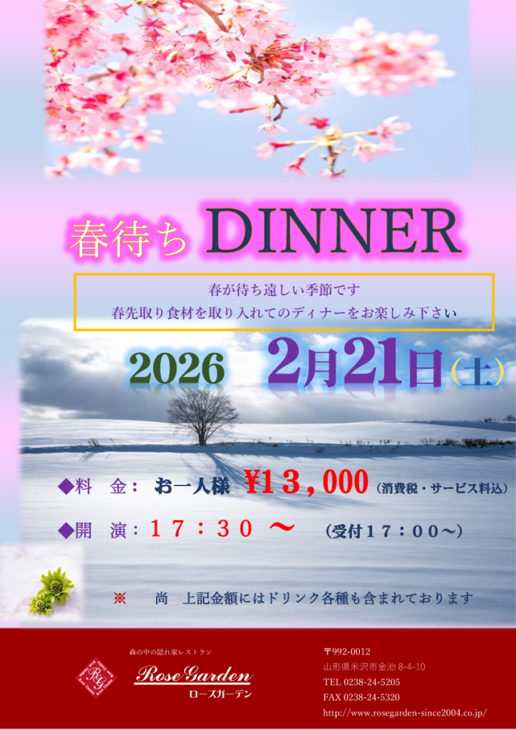 春待ちDINNER 2025 12/26 イベント 2025年12月26日 2025年12月26日 2026springdinnerダウンロード イベント 【ご宴会】春爛漫 花プラン ローズレッスン 2026年1月・2月の予定