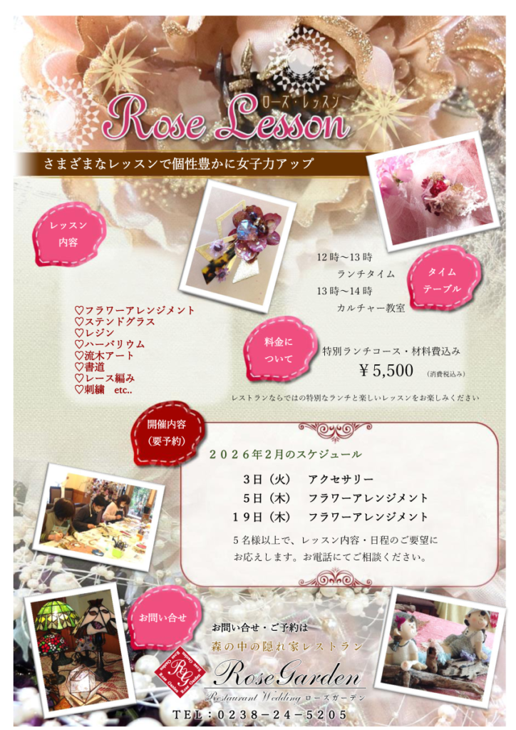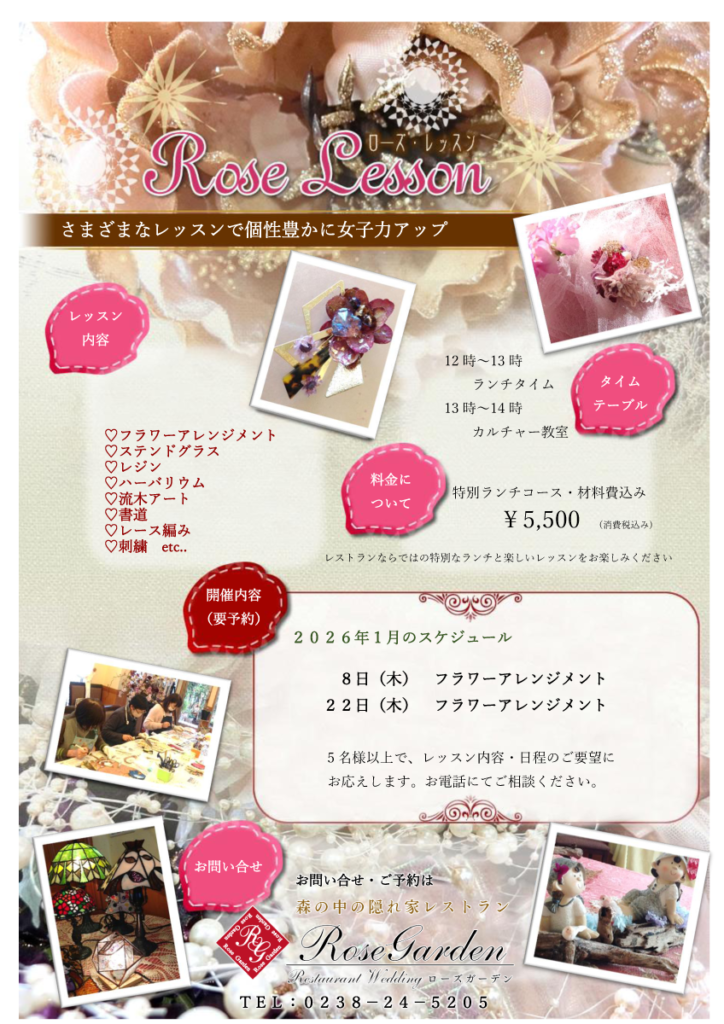 ローズレッスン 2026年1月・2月の予定 2026 1/09 ローズレッスン 2026年1月9日 2026年1月9日 lesson202601-2ダウンロード lesson202602ダウンロード ローズレッスン 春待ちDINNER